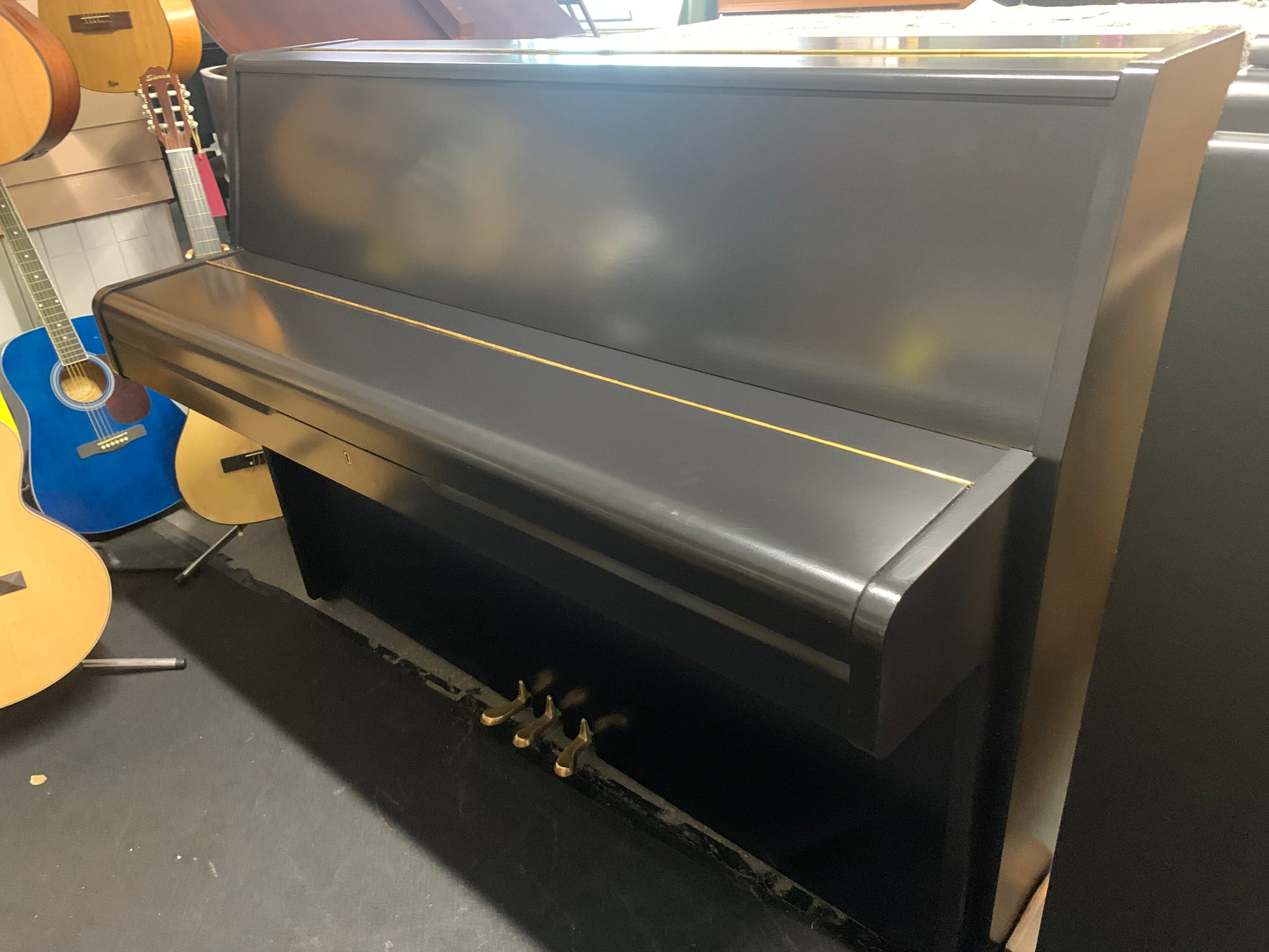 A black-resprayed upright piano with a clean, satin Matt finish that gives it a refreshed, modern look. It features a full 88-keys , a 3-pedal assembly, and a modern overstrung design for improved tone and resonance. Smart, reliable, and visually tidy, it’s a solid choice for home use, students, or general practice.