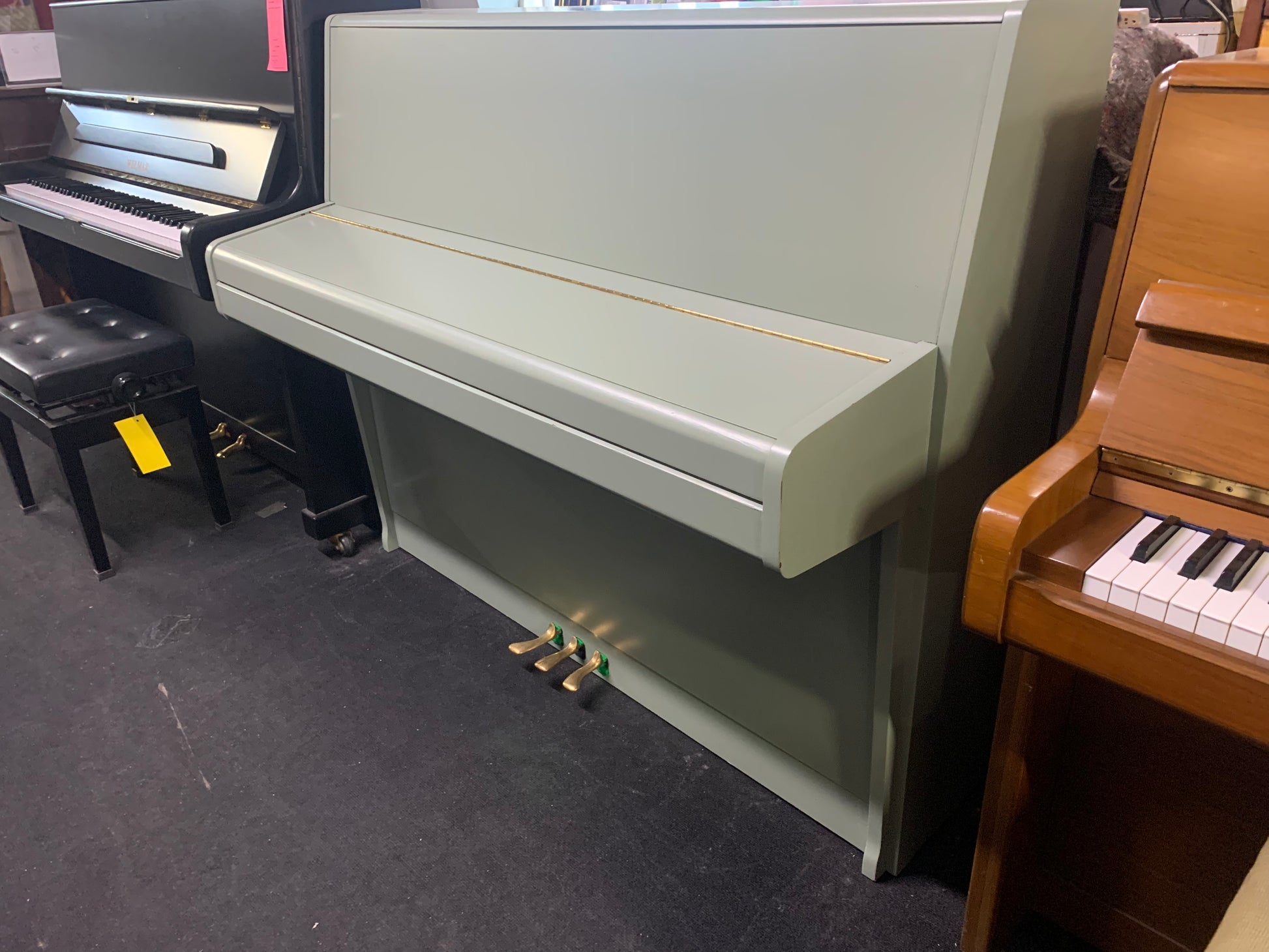 Light Green Danemann Upright Piano.beautifully resprayed light-green featuring a full 88-key keyboard and 3-pedal assembly. Its compact size makes it ideal for homes and studios while still delivering the classic Danemann tone.
