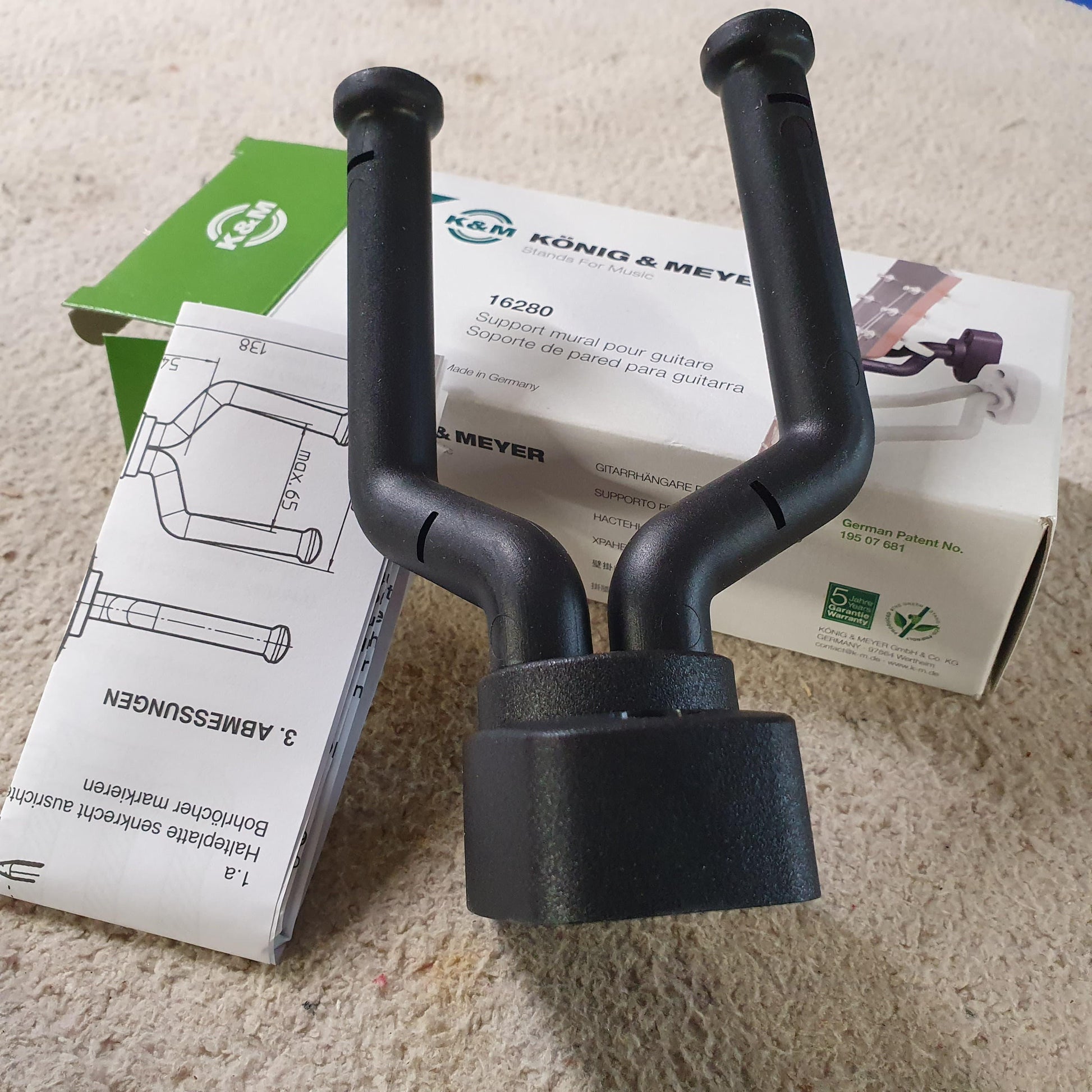 Screw-mounted guitar wall hanger. Features flexible support arms for various guitar models, covered with non-marking rubber to protect the instrument. Suitable for acoustic and electric guitars.